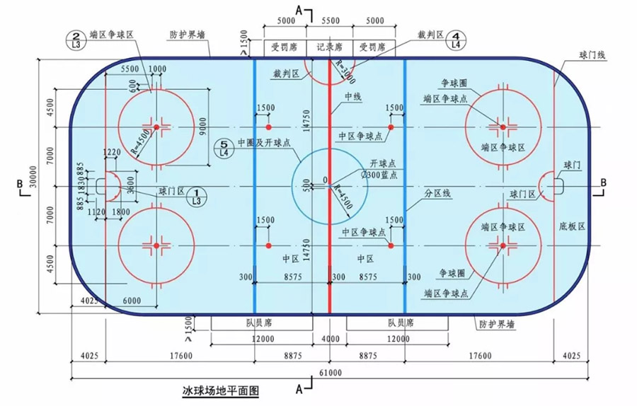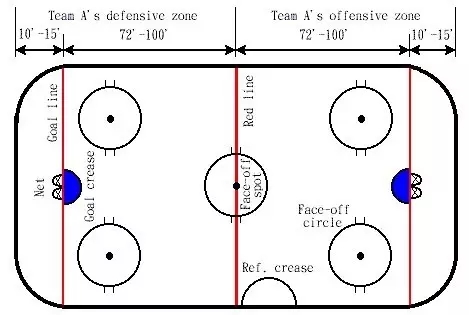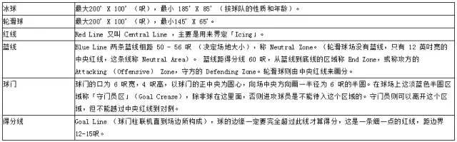 在冰球,攻方球员比球早进入Attacking Zone则造成越位违例,称为「Off -siding」。而在轮滑球是没有Off-siding的。球从一方的Defending Zone由此方球员传出,直接穿过这边的蓝线再越过红线(中线)而未经其它球员碰触,亦造成Off-siding违例。争球点(Face - off Spot):冰球球场上的7个黑点为争球点,以点为圆心15呎为半径画出的圆为争球圈,争球的时后其它球员不得进入此圈,一直要到裁判丢下的球着地后才可以开始动作。蓝线之间(Neutral Zone)有5个争球点,在红在线的是 Central Face - off Spot。蓝线边靠中央侧的争球点离蓝线5呎,轮滑球则无这四个。球场两头End Zone也各有两个争球点。一般在「死球」之后,会在距离发生死球处最近的争球点争球继续比赛。球场左右两翼(图的上下)的争球点相距44呎。