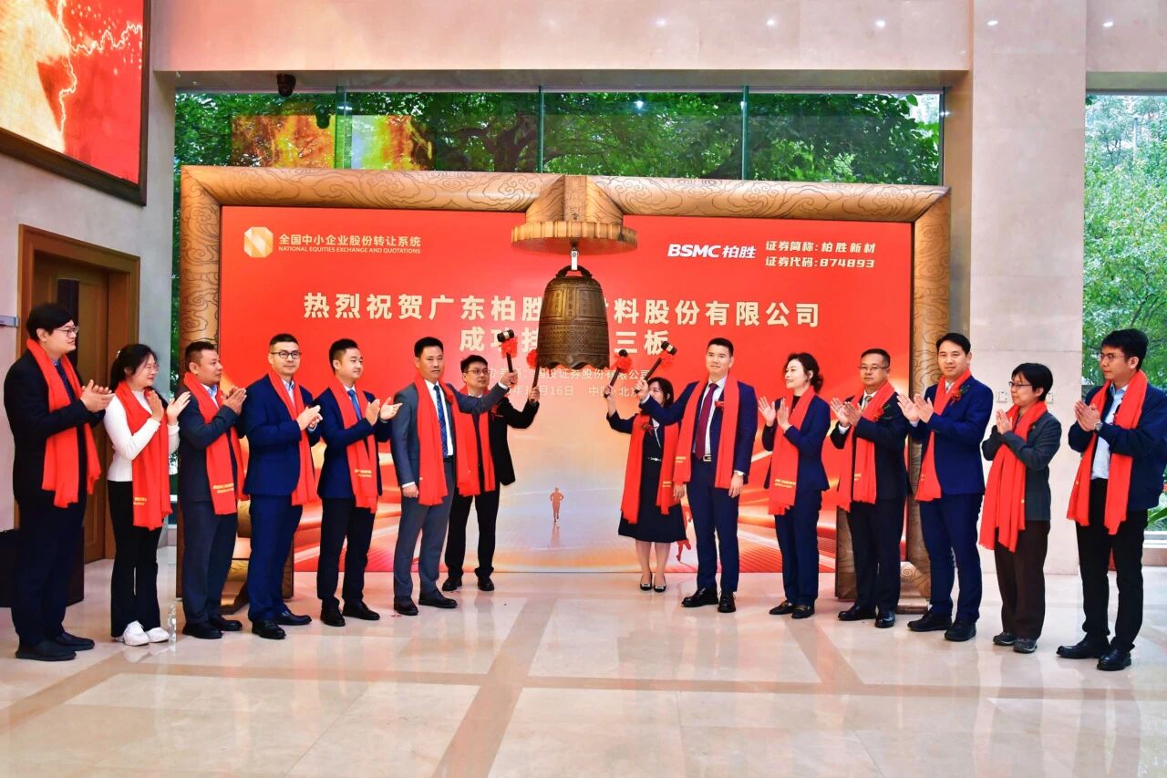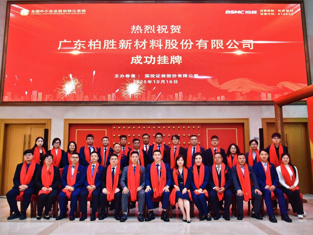 2025年10月16日,广东柏胜新材料股份有限公司(证券简称:柏胜新材,证券代码:874893)在全国股转系统(新三板)正式挂牌。这不仅是柏胜新材迎来了发展历程中的重要里程碑,意味着公司正式进入了资本市场培育梯队,开启“产业+资本”双轮驱动的新阶段,也标志着公司在更规范的治理体系和更广阔的资本平台支持下,为公司迈进“十五五”期间的高质量发展注入新动力。这一阶段成果的取得,离不开社会各界的支持与同行者的信任。在此,柏胜新材向所有同行者致以诚挚感谢。