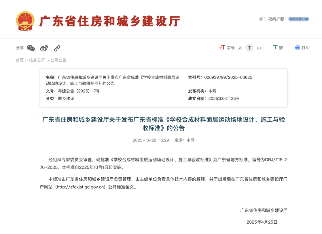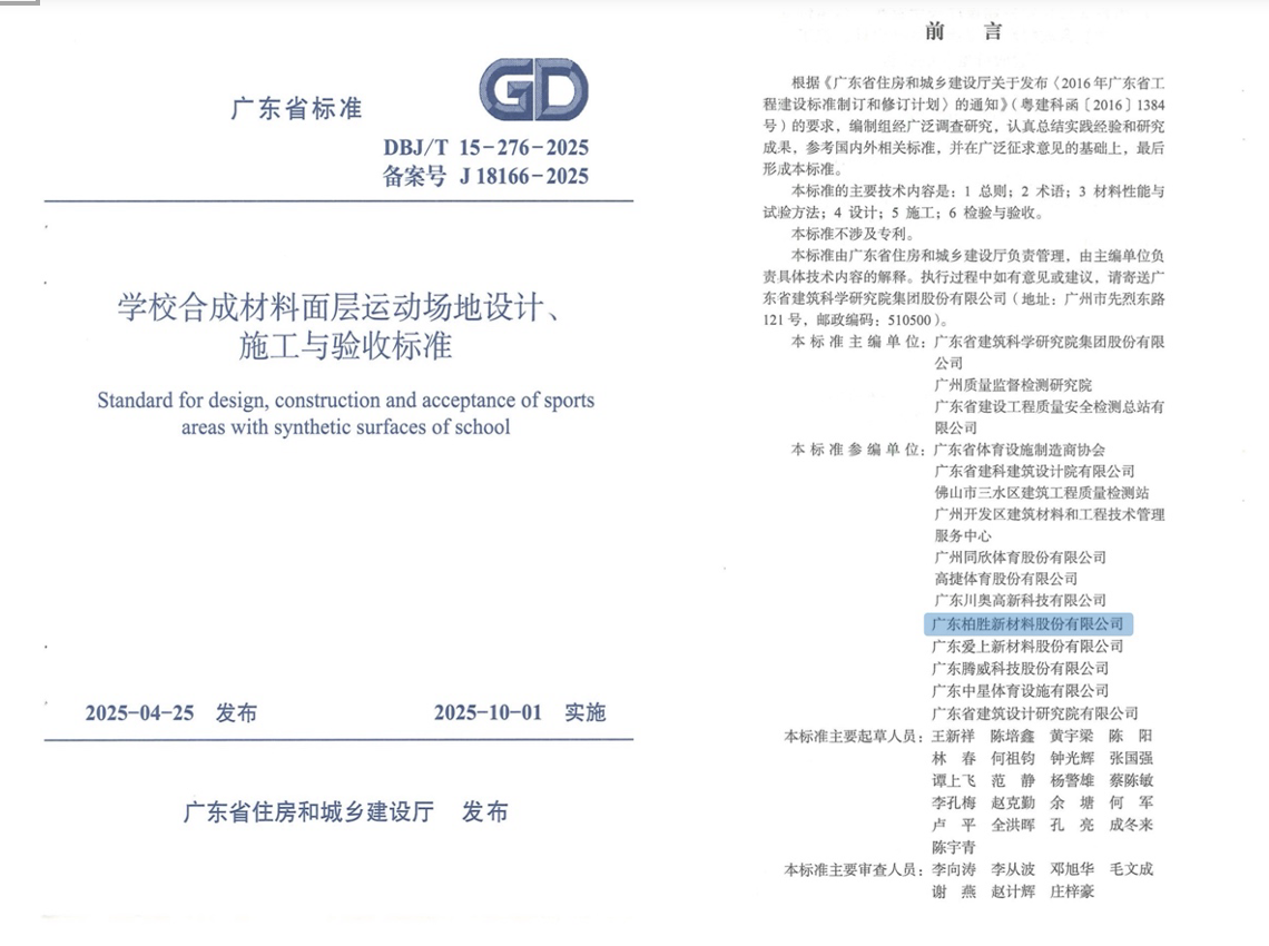 2025年10月28日,由广东省住房和城乡建设厅批准,广东省建筑科学研究院集团股份有限公司、广州质量监督检测研究院(广州质量检验研究院)、广东省建设工程质量安全检测总站有限公司联合主编,广东柏胜新材料股份有限公司等单位共同参编的广东省《学校合成材料面层运动场地设计、施工与验收标准》(DBJ/T15-276-2025)正式公开实施。该标准填补了广东省在该领域地方标准的空白,更以 “严于国标”的管控指标,为师生的健康安全和运动体验提供坚实保障。