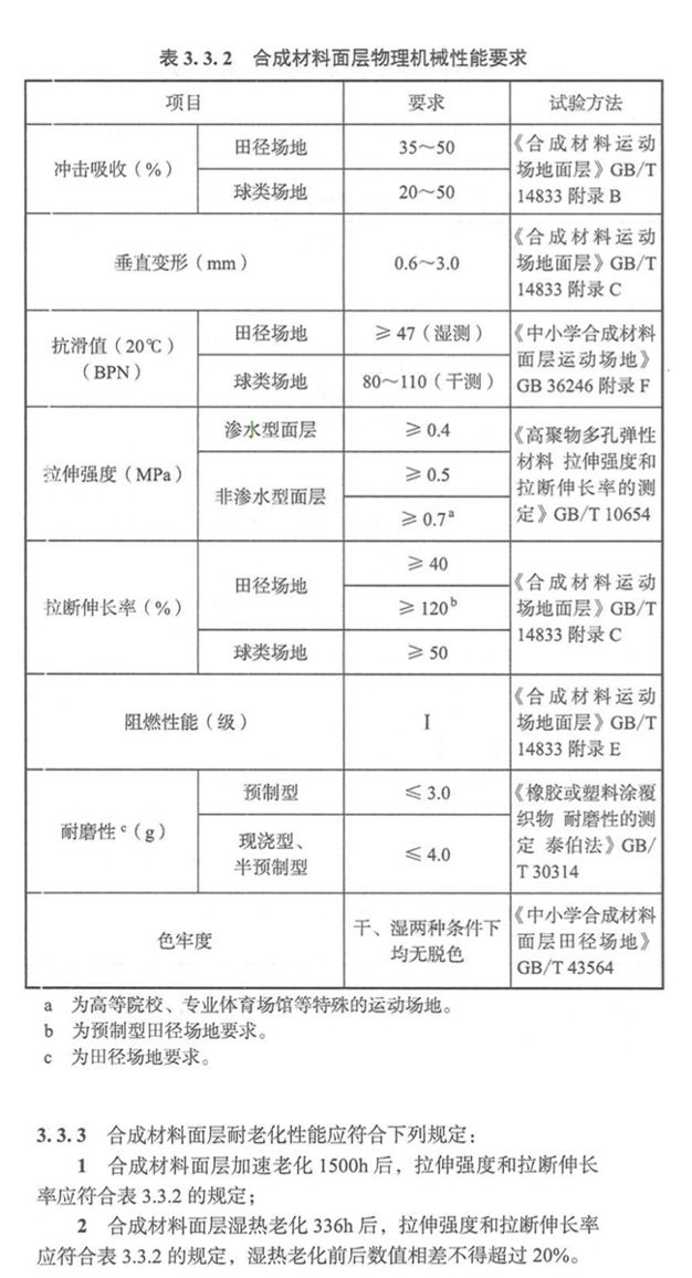 ▲ 合成材料面层物理机械性能要求及耐老化性能