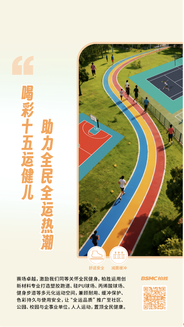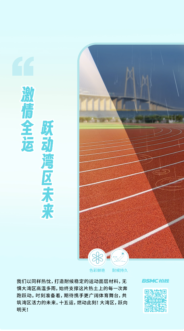 柏胜以创新材料,践行同样的绿色标准,呼应同样的全民热情,激扬同样的大湾区活力。以环保低VOC产品,守护日常运动的健康安全;凭全运同级的专业品质,赋能从体育场馆、校园、社区公园到企事业单位的多元场景;更以适应湾区高温多雨的稳定持久耐候性能,支撑这片热土上的每一次奔跑跃动,共筑湾区健康未来。
