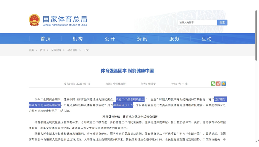 “用好”的核心,是让运动场地深度融入群众生活,满足人民对高品质健康生活的向往。两会高度重视青少年体育与全民健身,强调“完善校园体育设施标准化建设”;国家体育总局局长高志丹在“部长通道”答记者问时表示,要把更多场地设施、服务资源送到群众身边,让“15分钟健身圈”成为人民群众的幸福生活圈。近期教育部、国家体育总局相继发布《关于全面推进健康学校建设的指导意见》《2026年群众体育工作要点》,进一步强化“中小学生每天2小时运动”的刚性执行,以及系统部署“小而美”的群众身边场地设施建设(如口袋公园)。