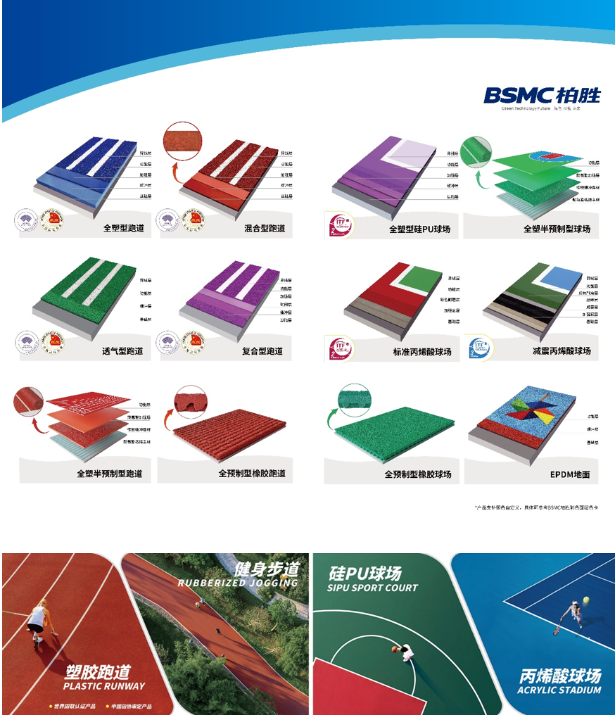 柏胜始终以政策为锚,以需求为核,提供全场景适配系统解决方案。在校园,推出更符合学生运动特点、环保安全的聚氨酯跑道与硅PU球场系统,守护健康成长第一线;在专业场馆与全民健身场所,优化升级硅PU、丙烯酸材料的运动性能与耐候性,平衡竞技表现与长期耐用;在城市社区、公园绿道及企事业单位职工活动区,打造防滑耐磨、全龄适用的EPDM健身步道系统,让便民友好的运动空间触手可及。