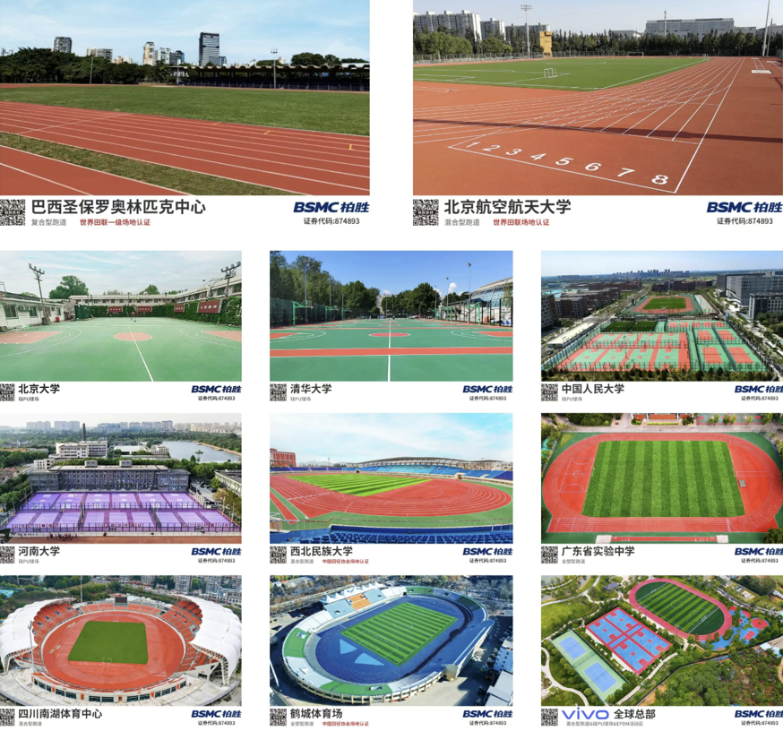 迄今,柏胜产品与解决方案已广泛应用于全国各级学校、体育场馆、企事业单位及市政工程等领域,覆盖塑胶跑道、硅PU球场、丙烯酸球场、健身步道等多类场景,并服务于全球80多个国家和地区,累计铺设面积超5000万平方米。